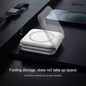 Crafted from high-quality ABS and aluminum alloy, the charger features a sleek white matte finish, foldable design, and silicone anti-slip surface for secure placement.